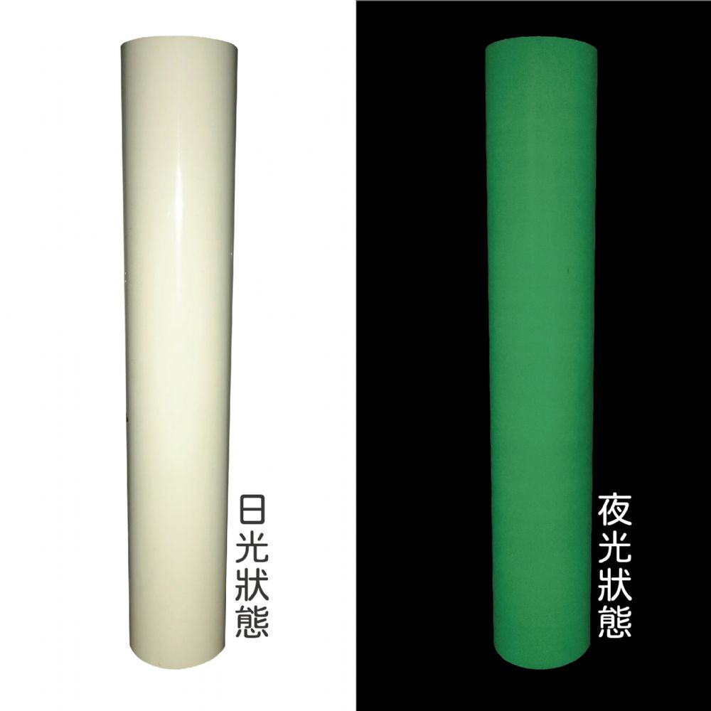 產品特質:綠色夜光刻字膜為彈性TPU材質,搭配雷射切割機將圖案切割完後再挑除廢料即可轉印至成品上,夜光刻字膜透過吸收光線後可以在黑暗中達到發光的效果,能夠重複的吸收儲存後再發光,色澤鮮豔質地柔軟有彈性,大多使用在休閒衣服、服飾配件等。