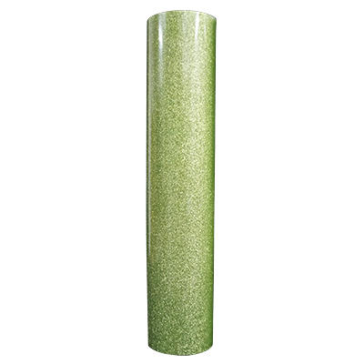 產品特質:淺綠色金蔥刻字膜為彈性TPU材質,搭配雷射切割機將圖案切割完後再挑除廢料即可轉印至成品上,金蔥刻字膜經高溫燙印也不易變形,金蔥粉細緻不易掉粉,閃光效果均勻,色澤鮮豔且款式選擇多,大多使用在童裝、服飾配件等。