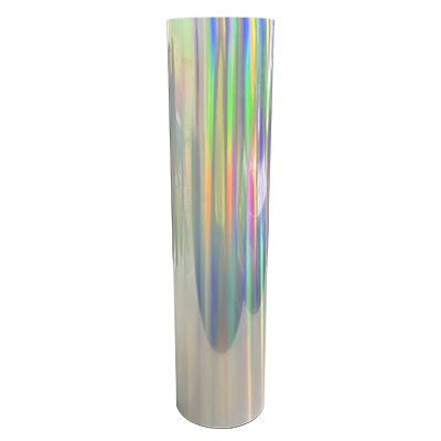產品特質:五彩鐳射刻字膜搭配雷射切割機將圖案切割完後再挑除廢料即可轉印至成品上,鐳射刻字膜光亮奪目、色澤繽紛選擇多,因為角度不同會有不同的折射變化,大多使用在休閒服飾或裝飾上。
