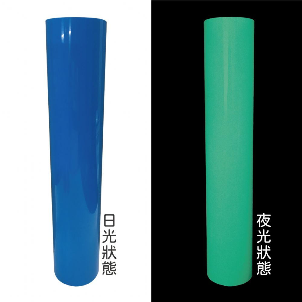 產品特質:彩藍夜光刻字膜為彈性TPU材質,搭配雷射切割機將圖案切割完後再挑除廢料即可轉印至成品上,夜光刻字膜透過吸收光線後可以在黑暗中達到發光的效果,能夠重複的吸收儲存後再發光,色澤鮮豔質地柔軟有彈性,大多使用在休閒衣服、服飾配件等。